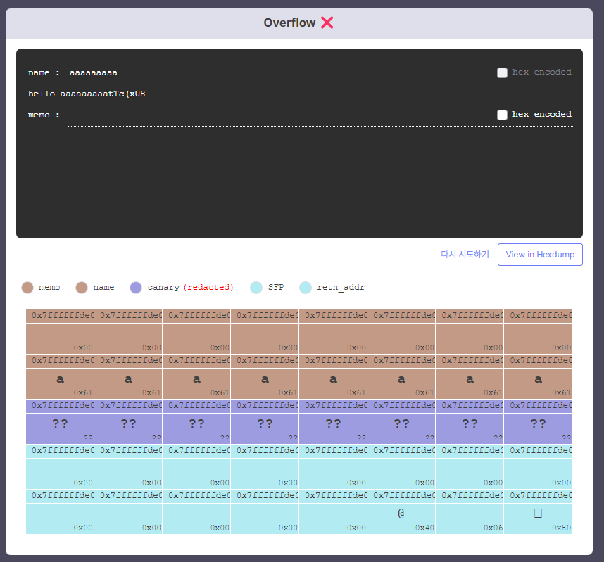 코드를 한 줄 실행시키면, rbp-0x8에 저장된 카나리 값이 버퍼 오버플로우로 인해 0x4848484848484848이 된 것을 확인할 수 있다.
