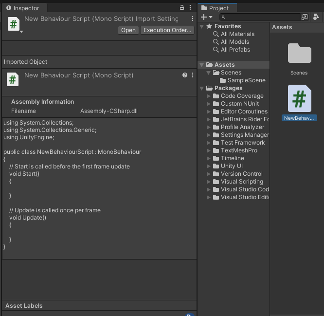 파일을 생성한 직후에는 아래 그림과 같은 상태로 이때 파일 이름을 수정하면 스크립트 파일 내부의 클래스 이름이 파일 이름과 동일하게 변경된다 이후에 이름을 변경할 때는 클래스 이름과 파일 이름을 직접 수정해야 한다.