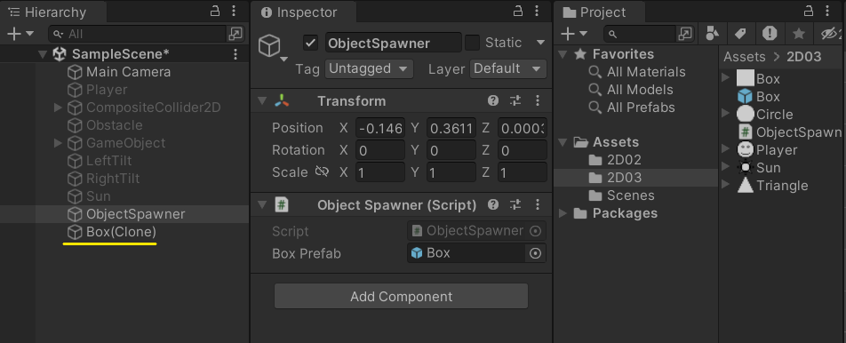 위의 코드와 같이 boxPrefab라는 변수에 등록된 게임오브젝트를 복제해서 생성하게 된다.